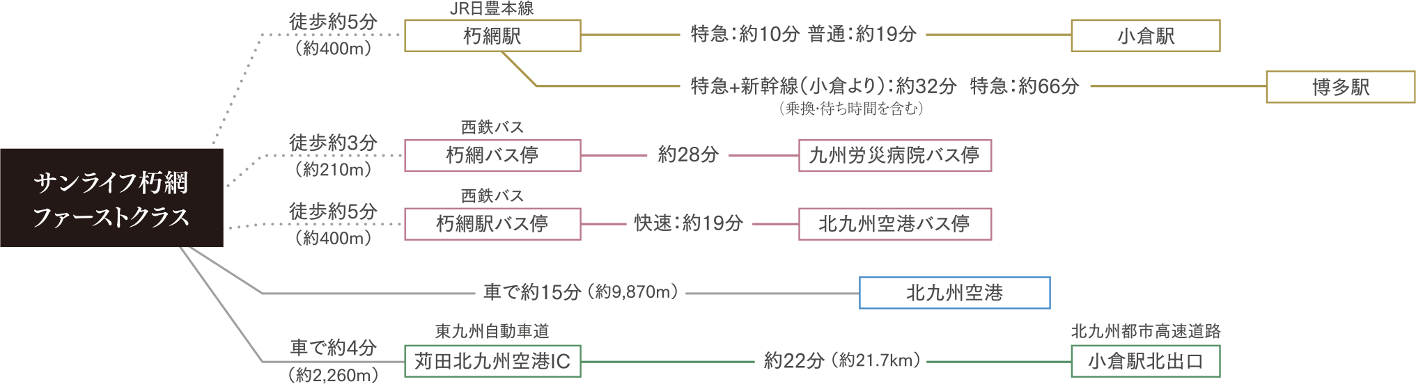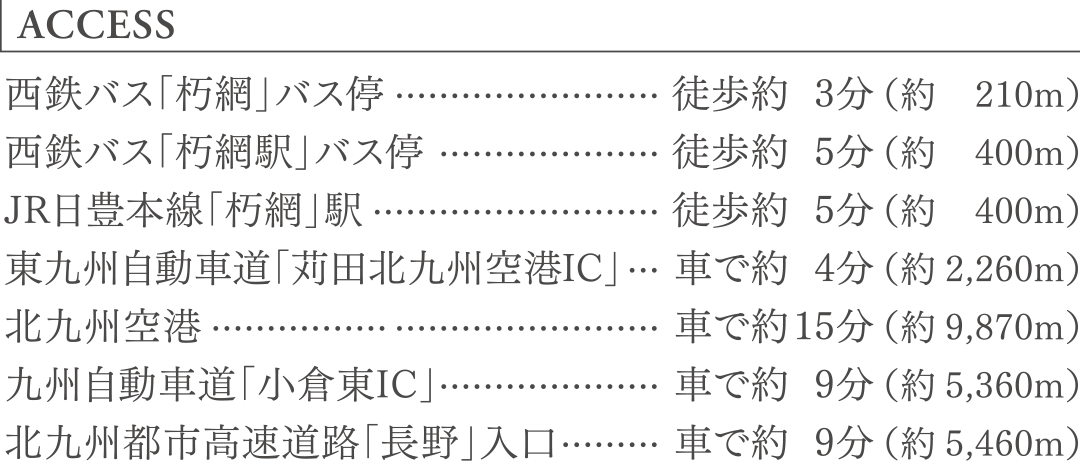 ※徒歩分数は80m=1分、自転車分数は240m=1分、車分数は一般道は時速40km/h、東九州自動車道・北九州都市高速は時速60km/hにて算出しております。