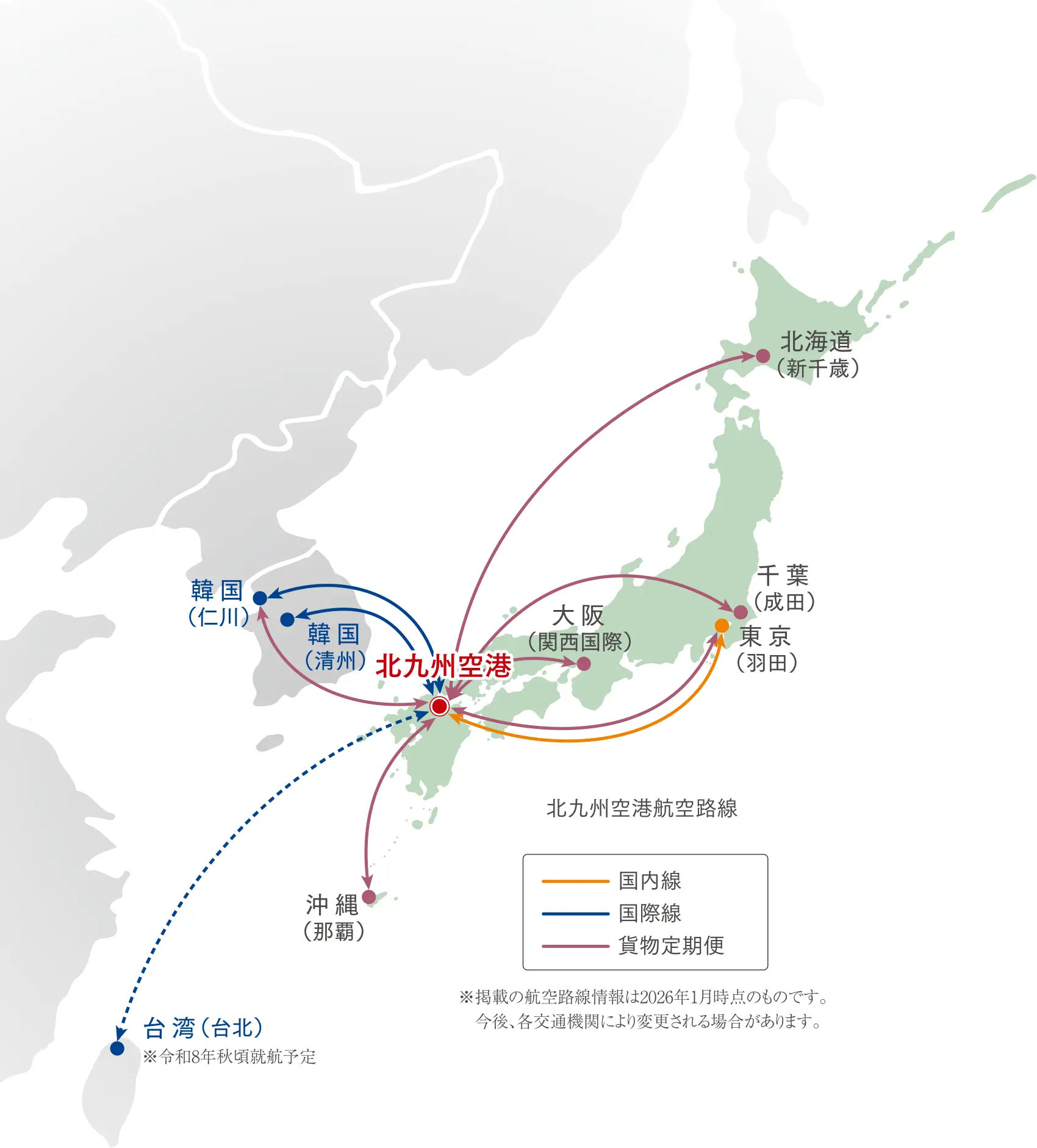 北九州空港は、アジアに近い立地を活かした物流ハブとして九州一円の経済を支える一翼を担う空の結節点であり、ビジネスシーンはもとより、レジャーシーンにおいても、各地への快適なアクセスを叶える重要な役目を担っています。