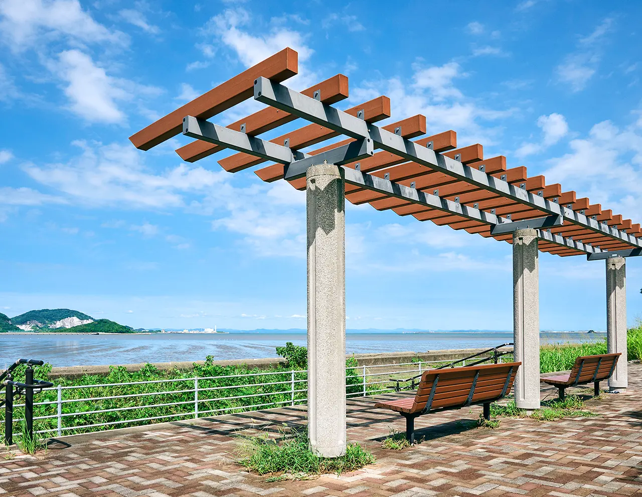 発着する航空機や北九州空港へと繋がる連絡橋が伸びやかな風景を描き、海沿いを朽網臨空公園の緑が潤い豊かに縁取ります。